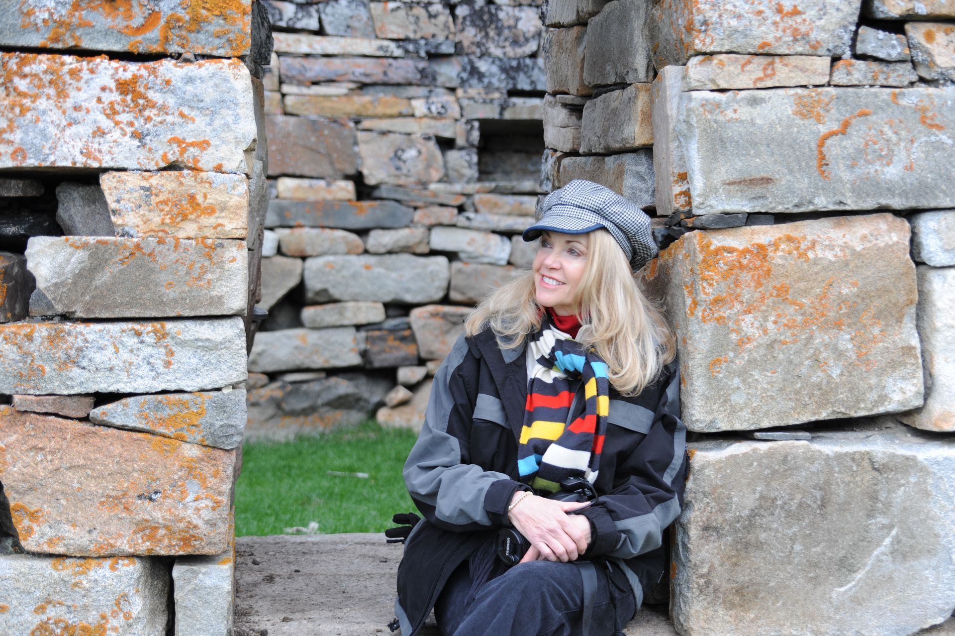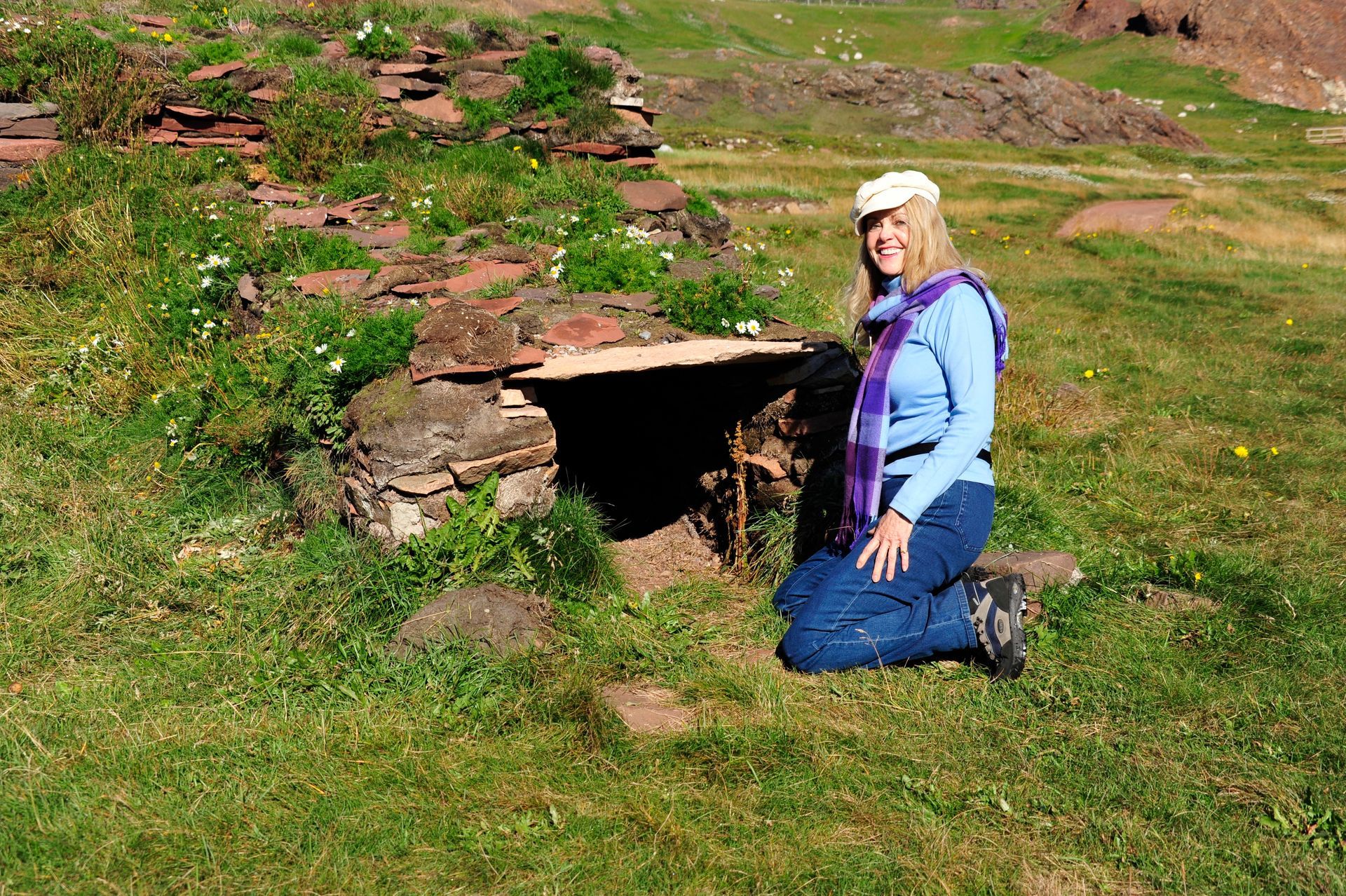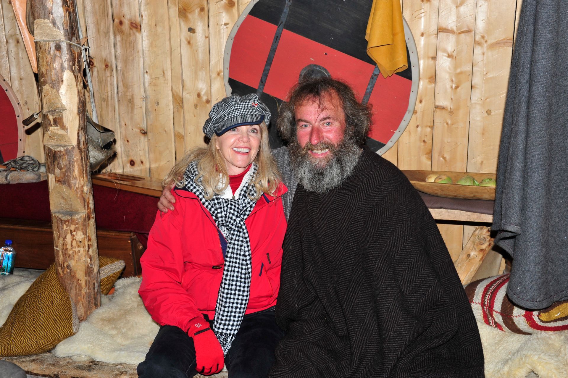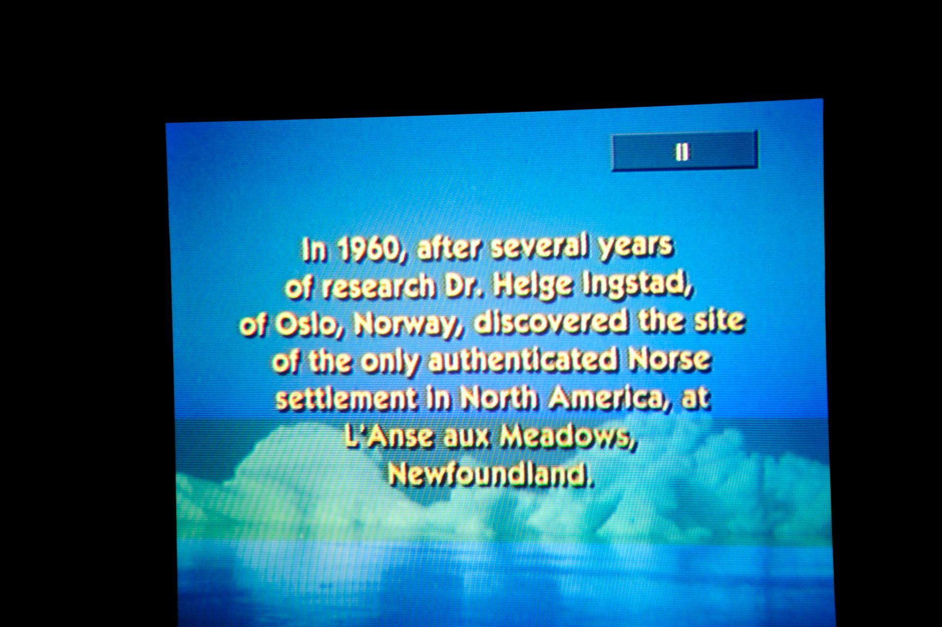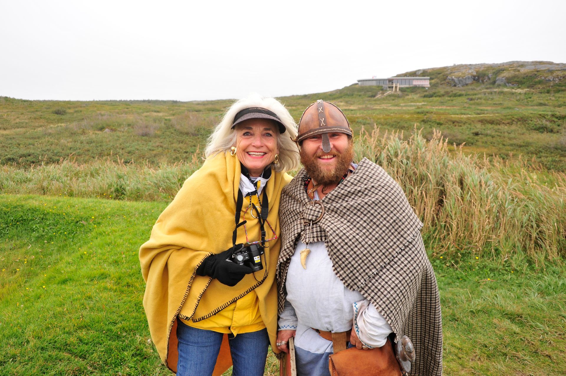 The ruins themselves are not much to look at - large grass-covered mounds arranged in a square. So you need a good guide. Unfortunately since we were now out of the Arctic, we had forgotten the cardinal rule of dress: layer, layer, layer; and so we stood in a bitter-cold wind unprepared for the chill, listening to a very long-winded explanation from the Guide about the Vikings and their culture, literally freezing! At one point I looked around to see that Len had disappeared; and, I had grown so cold that I ran on ahead and ducked into one of the restored huts. Inside, I was rewarded by the sight of Len sitting comfortably, as he warmed his hands by a crackling fire while engaged in conversation with an actor-historian dressed in period costume, who was explaining the activities that took place in that particular hut! Eyeing me, Len got a Cheshire grin on his face, and sheepishly moved over to make room for me on his hay-bale bench . . . a fine Viking he would make!!