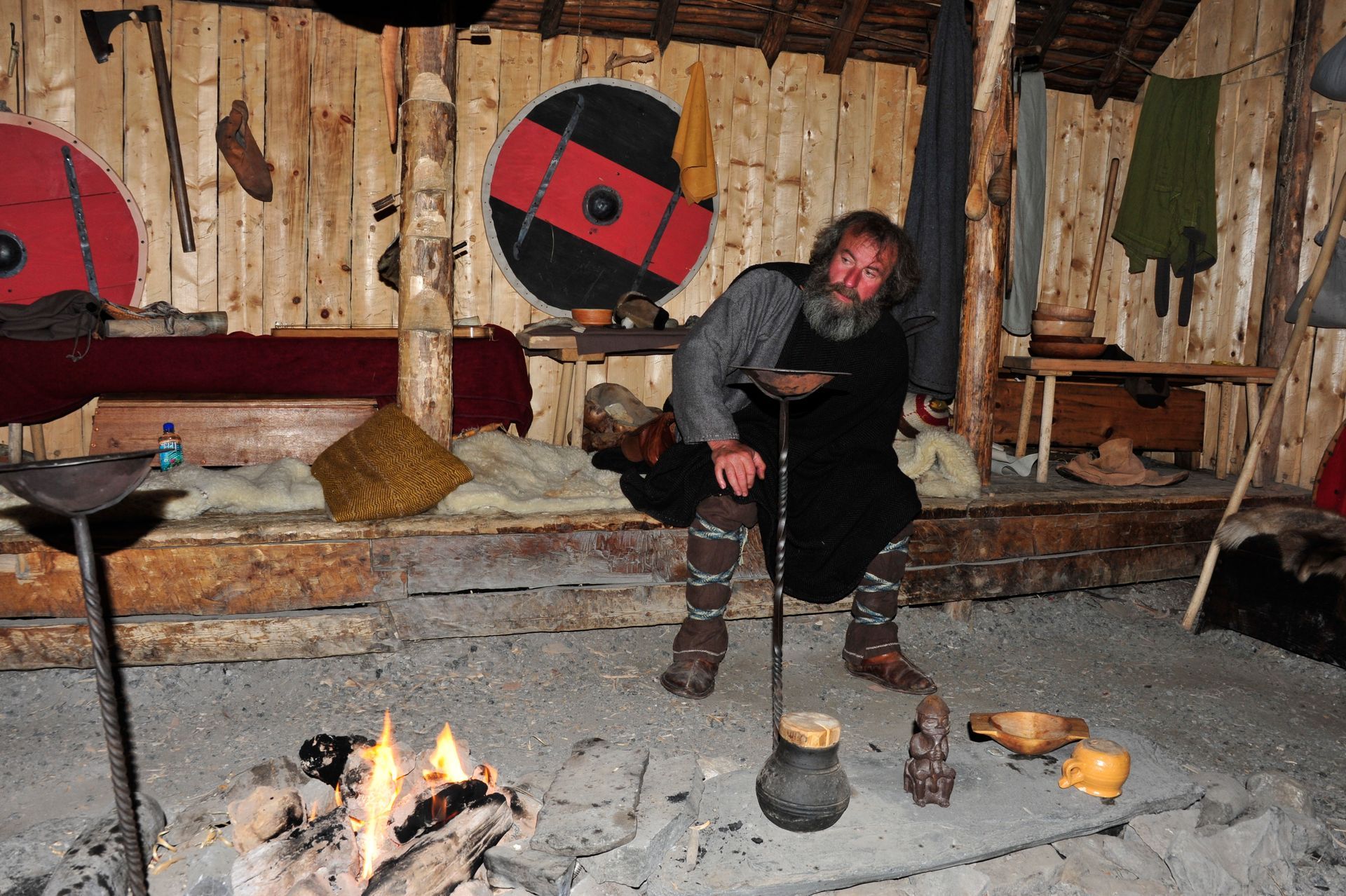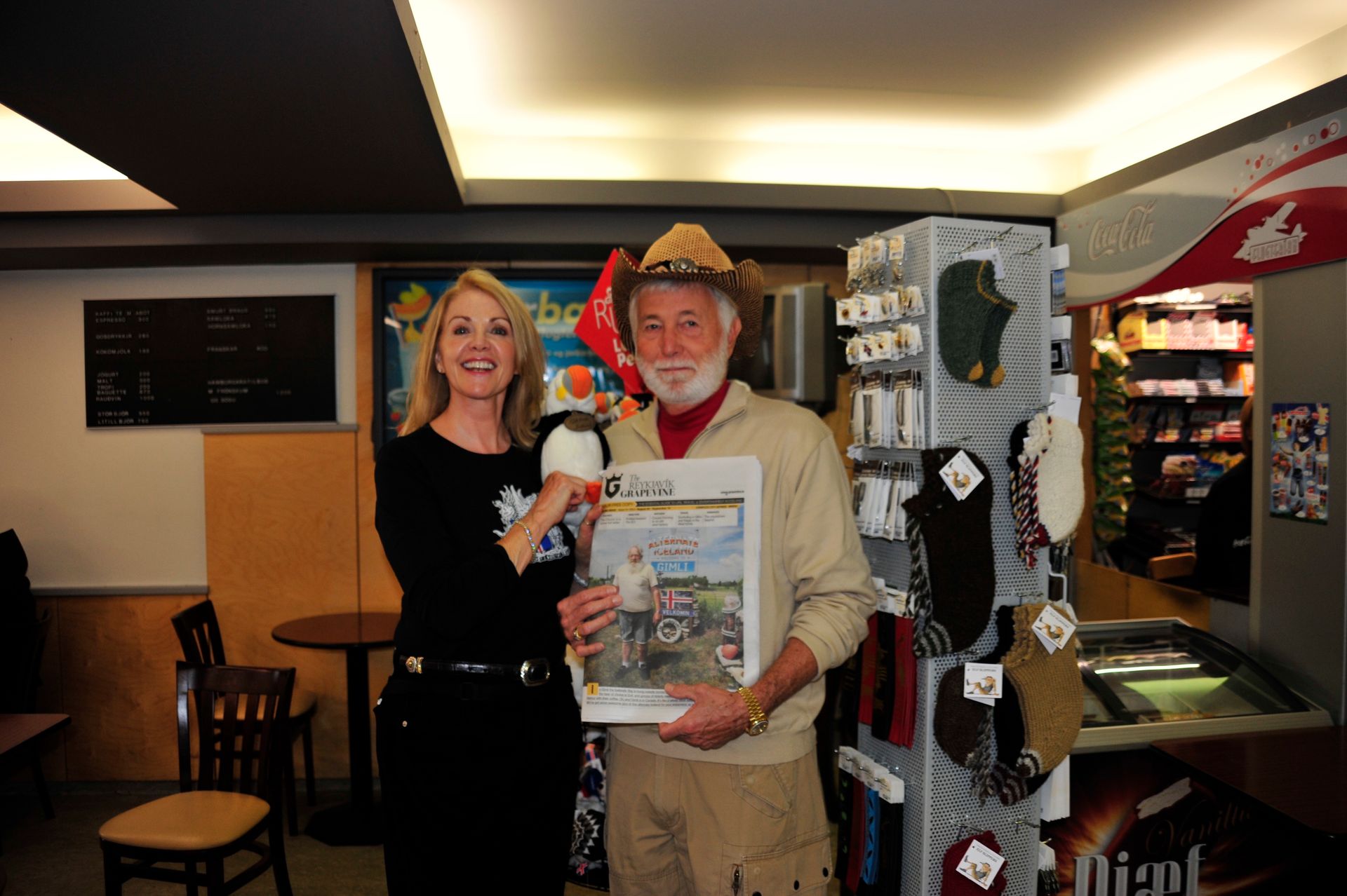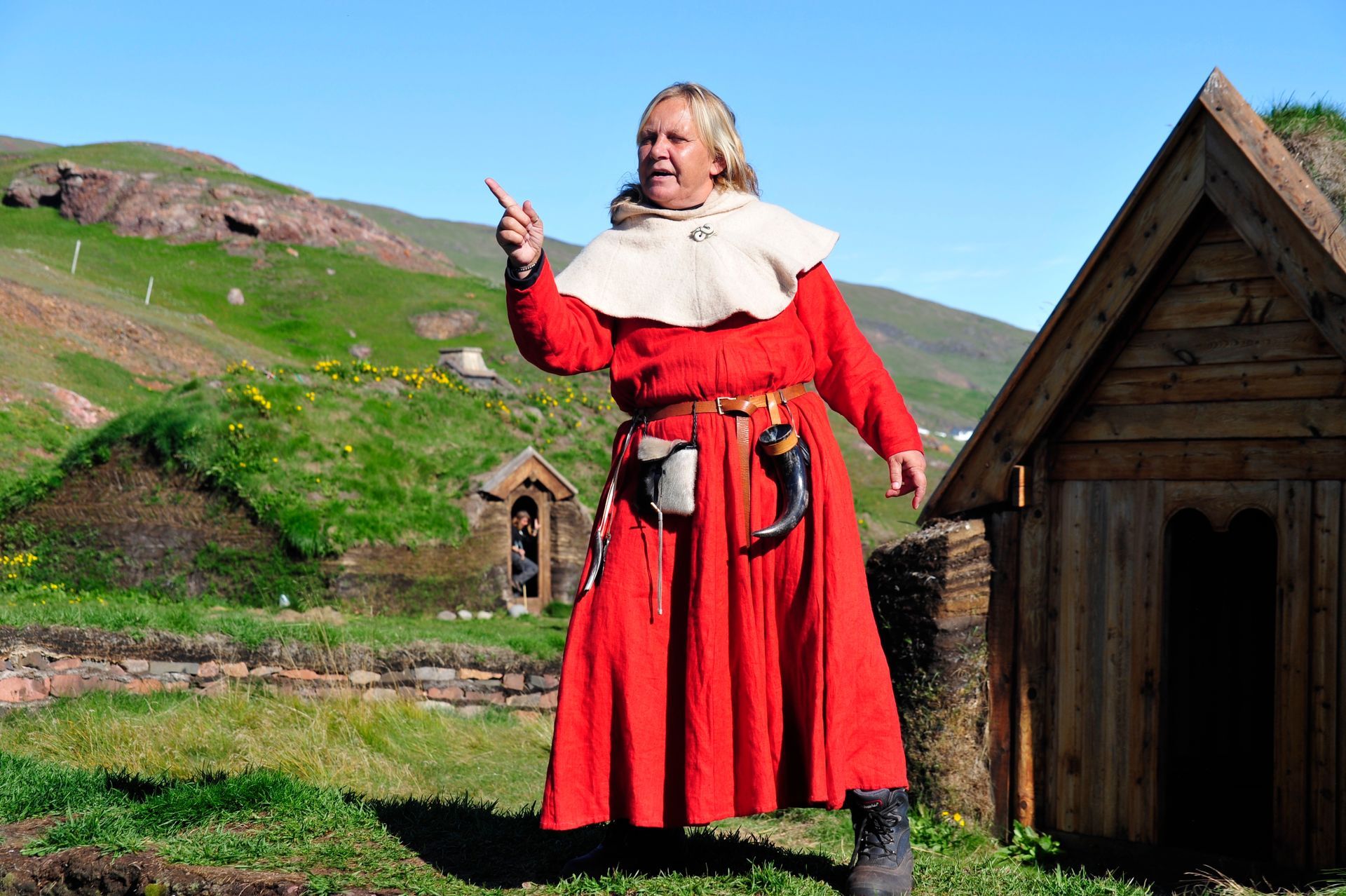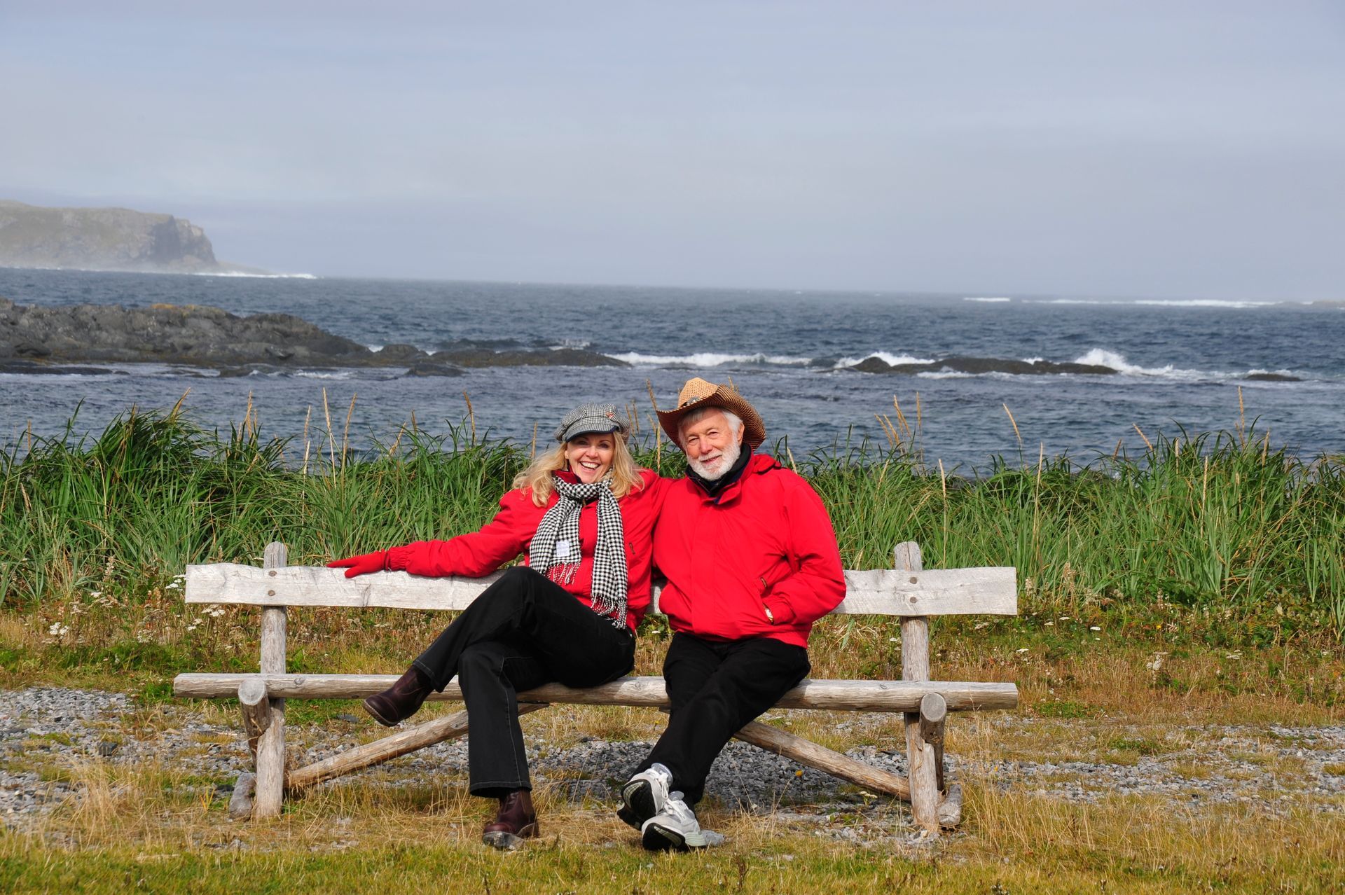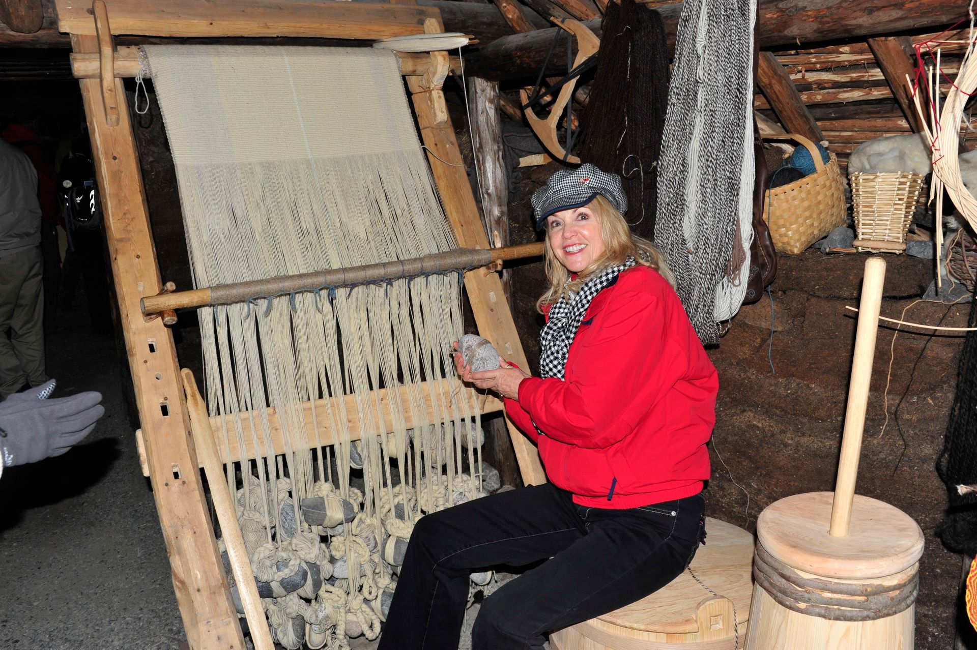 The ruins themselves are not much to look at - large grass-covered mounds arranged in a square. So you need a good guide. Unfortunately since we were now out of the Arctic, we had forgotten the cardinal rule of dress: layer, layer, layer; and so we stood in a bitter-cold wind unprepared for the chill, listening to a very long-winded explanation from the Guide about the Vikings and their culture, literally freezing! At one point I looked around to see that Len had disappeared; and, I had grown so cold that I ran on ahead and ducked into one of the restored huts. Inside, I was rewarded by the sight of Len sitting comfortably, as he warmed his hands by a crackling fire while engaged in conversation with an actor-historian dressed in period costume, who was explaining the activities that took place in that particular hut! Eyeing me, Len got a Cheshire grin on his face, and sheepishly moved over to make room for me on his hay-bale bench . . . a fine Viking he would make!!