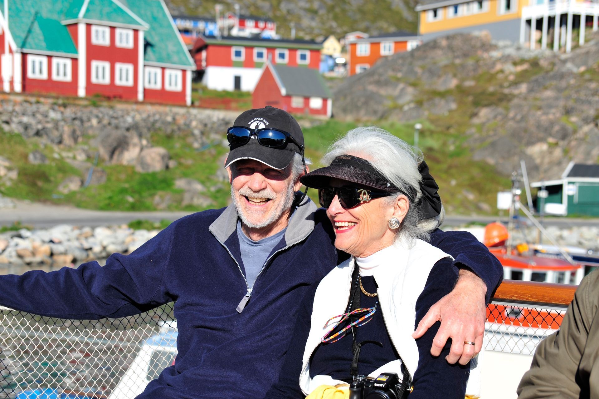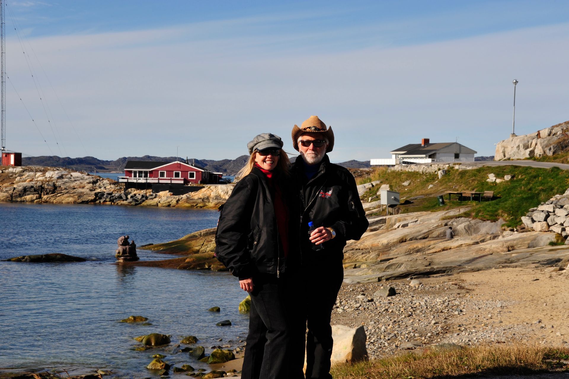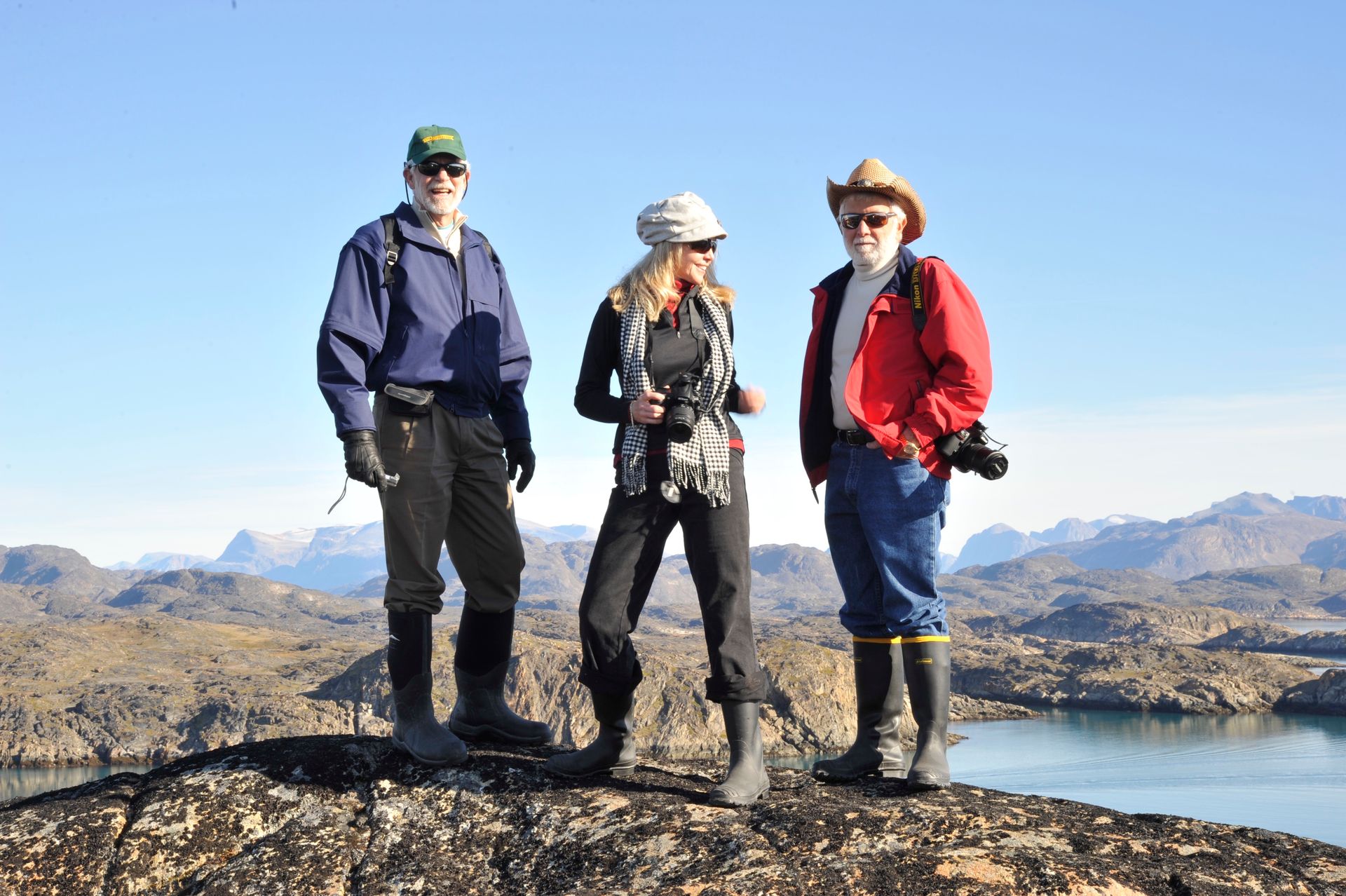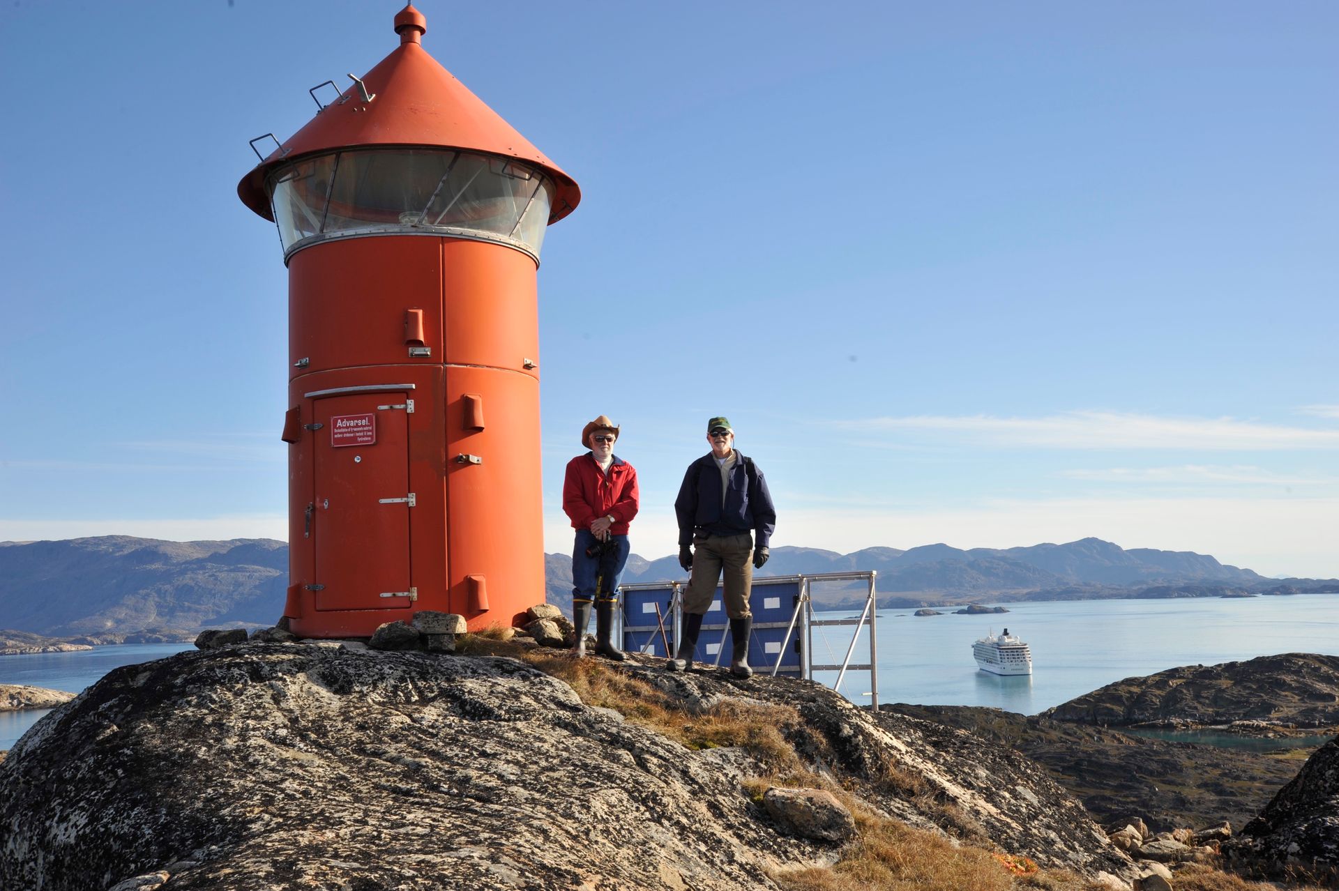 At Hvalsey, we explored the ruins of Hvalsey Church, built by Norse Settlers from Iceland who populated the area from 985 to 1410AD. Southern Greenland’s largest village, Qaqortoq, is populated with striking primary colored wood colonial buildings. While there, we toured the Great Greenland Furhouse and saw the stretched dried hides of the many types of seals that populate the area. They have a large export business and we saw literally thousands of dyed sealskins stacked and ready for shipment. Brattahild is the site of Erik the Red’s Farmstead. It is here that in the years 1961-64 archaeologists uncovered the remains of a small Christian church, dated to 1000 AD, believed to be Erik’s wife, Tjoldhilde’s, Church. She and her son, Lief had converted to Christianity, but Erik the Red never relinquished the Norse Gods, who had accompanied him safely to this new land. At the very tiptop of a rather steep and rocky hill on Sydday Island stands a lighthouse; and, Len, Dennis and Pat can proudly say they were among the hardy (or foolhardy) few who made their way to the pinnacle. Someone had to stay below to capture the feat on film, so Graci and I volunteered : )